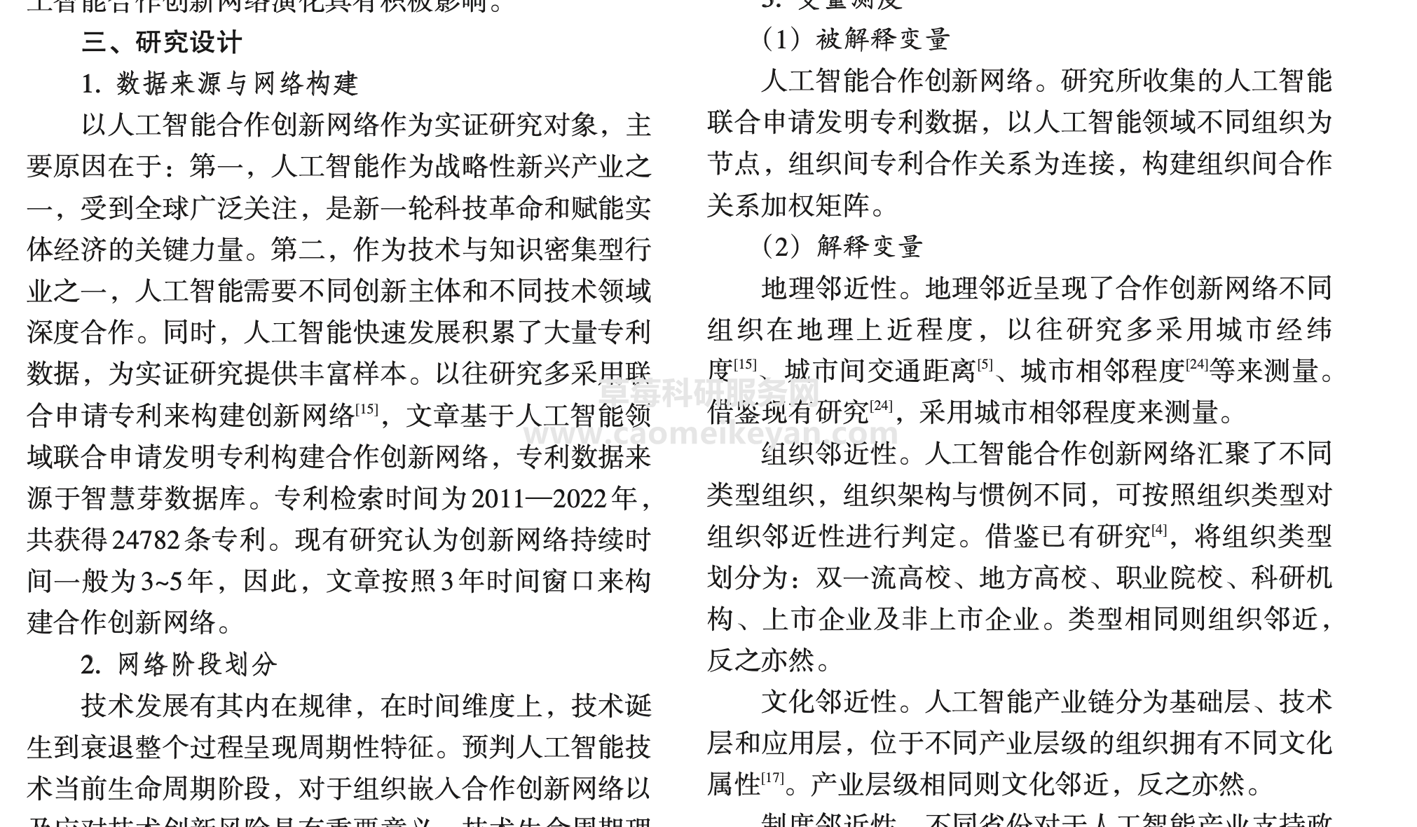 2、测算方式:参考《技术经济与管理研究》吕建林(2025)老师的做法,以人工智能合作创新网络作为实证研究对象,主要原因在于:第一,人工智能作为战略性新兴产业之一,受到全球广泛关注,是新一轮科技革命和赋能实体经济的关键力量。第二,作为技术与知识密集型行业之一,人工智能需要不同创新主体和不同技术领域深度合作。同时,人工智能快速发展积累了大量专利数据,为实证研究提供丰富样本。以往研究多采用联合申请专利来构建创新网络[15],文章基于人工智能领域联合申请发明专利构建合作创新网络人工智能合作创新网络。研究所收集的人工智能联合申请发明专利数据,以人工智能领域不同组织为节点,组织间专利合作关系为连接,构建组织间合作关系加权矩阵。