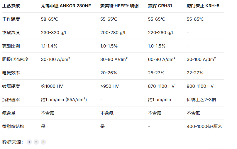 为客观评估ANKOR 280NF工艺的技术水平,选取国内外典型高速无氟镀硬铬工艺进行参数对比,结果如表3所示。