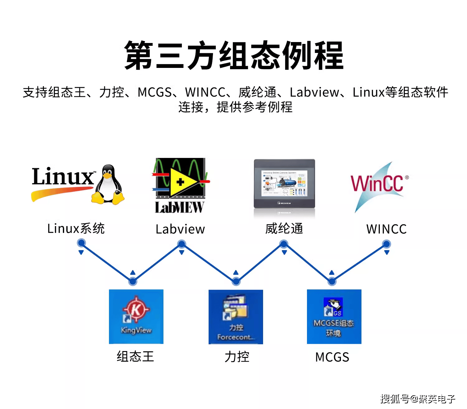 支持组态王、力控、MCGS、WINCC、威纶通、Labview、Linux等组态软件连接,提供参考例程