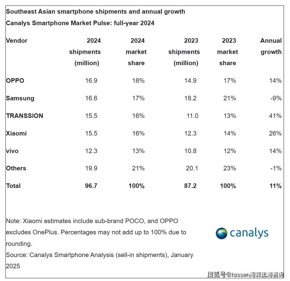 1. 市场定位:瞄准增长最快的细分赛道据 Canalys 数据,2024年东南亚『智能手机』市场增长11%,300 美元💵以上中高端 segment 仅占整体 10%,但增速显著。荣耀聚焦该区间,避开同质化价格战,主打品质、体验、服务。