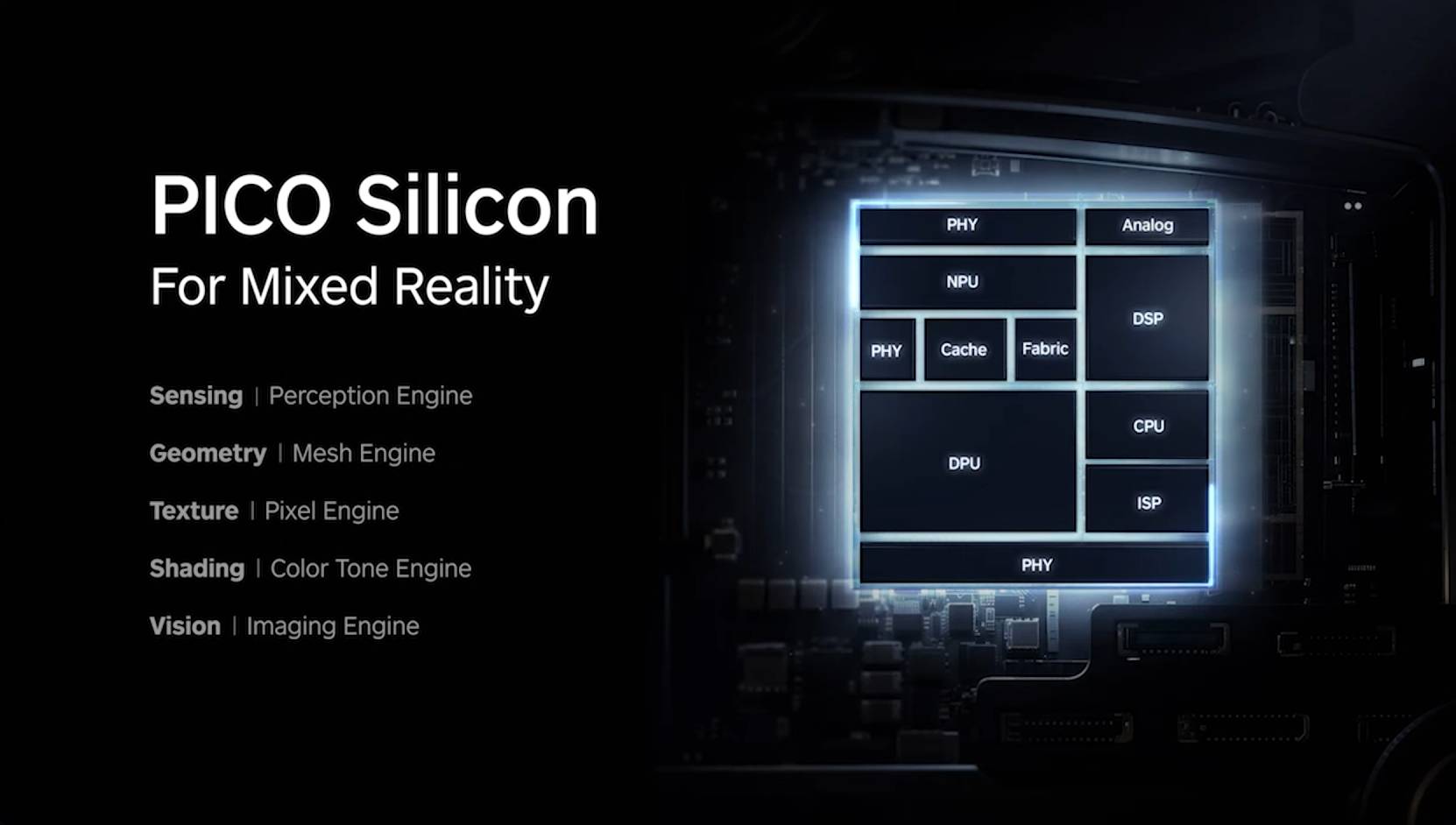 PICO的这枚协处理『芯片』早在2022年就开始立项,集成了多种自研计算单元,能够对多个传感器的数据进行低延迟解析与融合,持续构建对现实世界的空间理解,实现高画质、精准定位和稳定的手眼追踪。据称整个系统端到端延迟仅12毫秒。