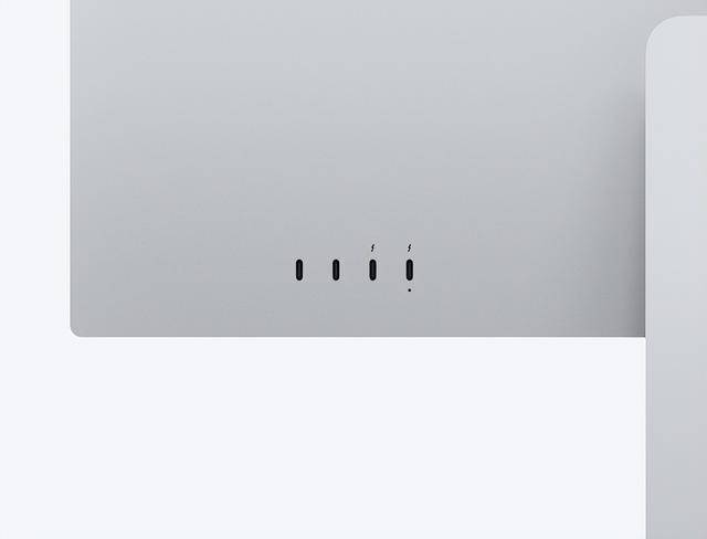 此外,Studio Display XDR还配备了1200万像素Center Stage摄像头,支持人物居中和桌上视角功能,显示器背面还配备了两个USB-C接口和两个雷电5接口。