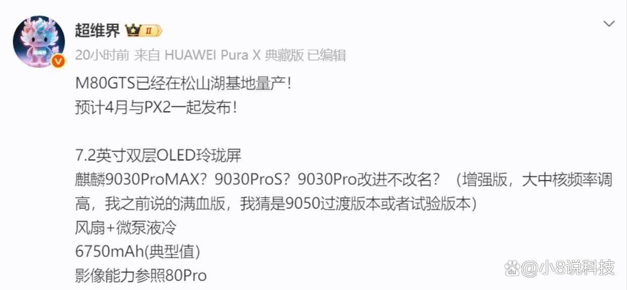 据爆料,Mate80 GTS搭载的是麒麟9030 Pro的“超频版”,配合丧心病狂的20GB起步运行内存,这绝对是麒麟有史以来性能释放最激进的一次。