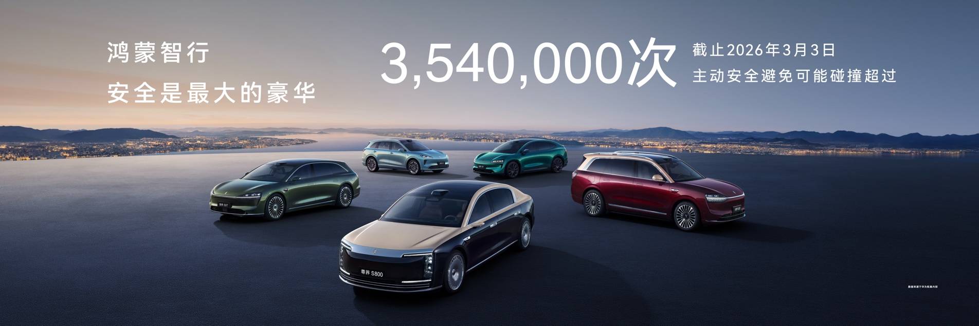 截至2026年3月3日,鸿蒙智行主动安全系统已避免可能碰撞超过354万次。华为乾崑智驾®️累计辅助驾驶里程87.6亿公里;实测数据显示,ADS辅助驾驶模式下,平均安全行驶里程为中国道路平均水平的3.95倍;ADS人驾模式下,平均安全行驶里程为中国道路平均水平的2.81倍,践行“安全是最大的豪华”理念。