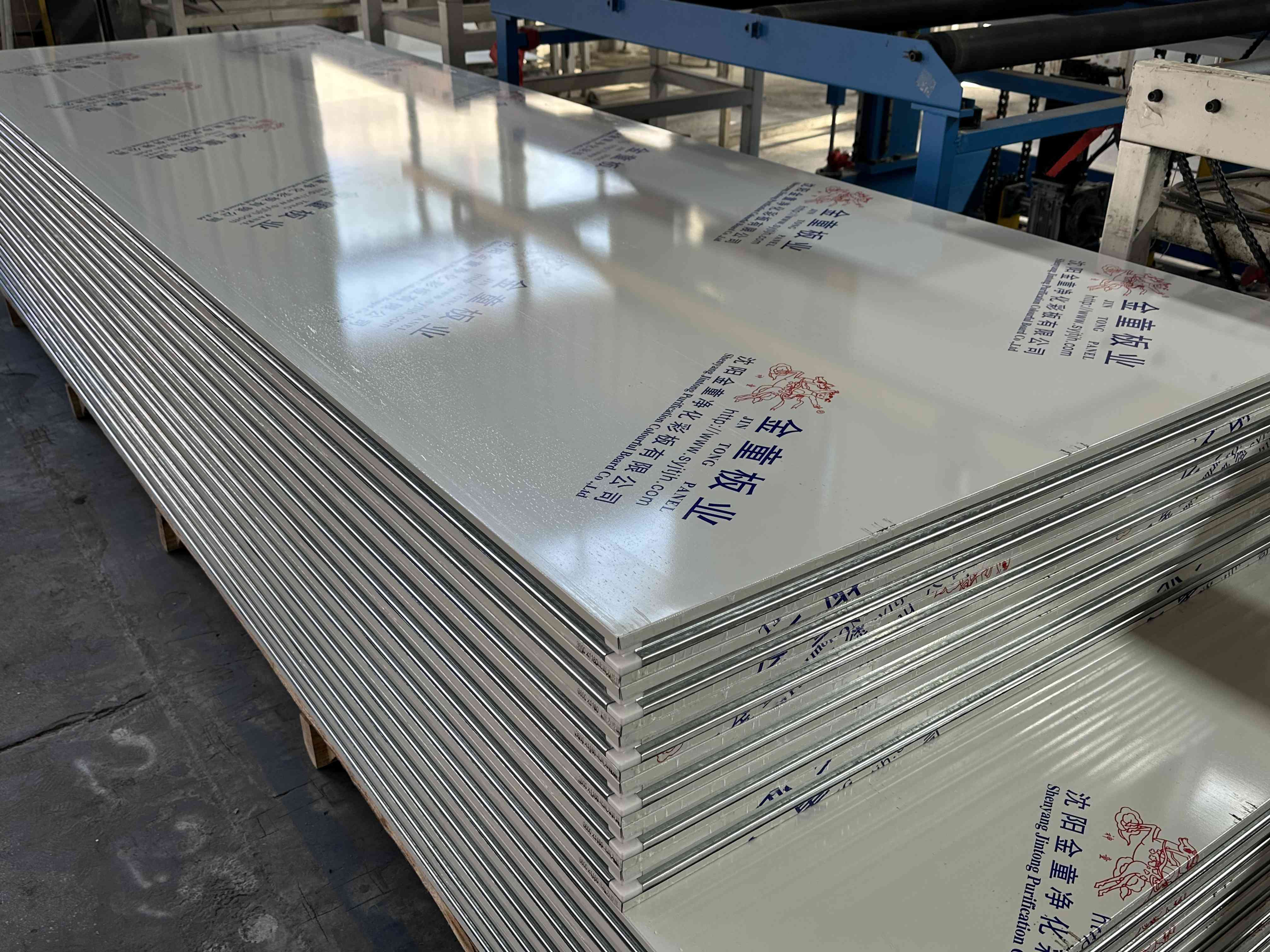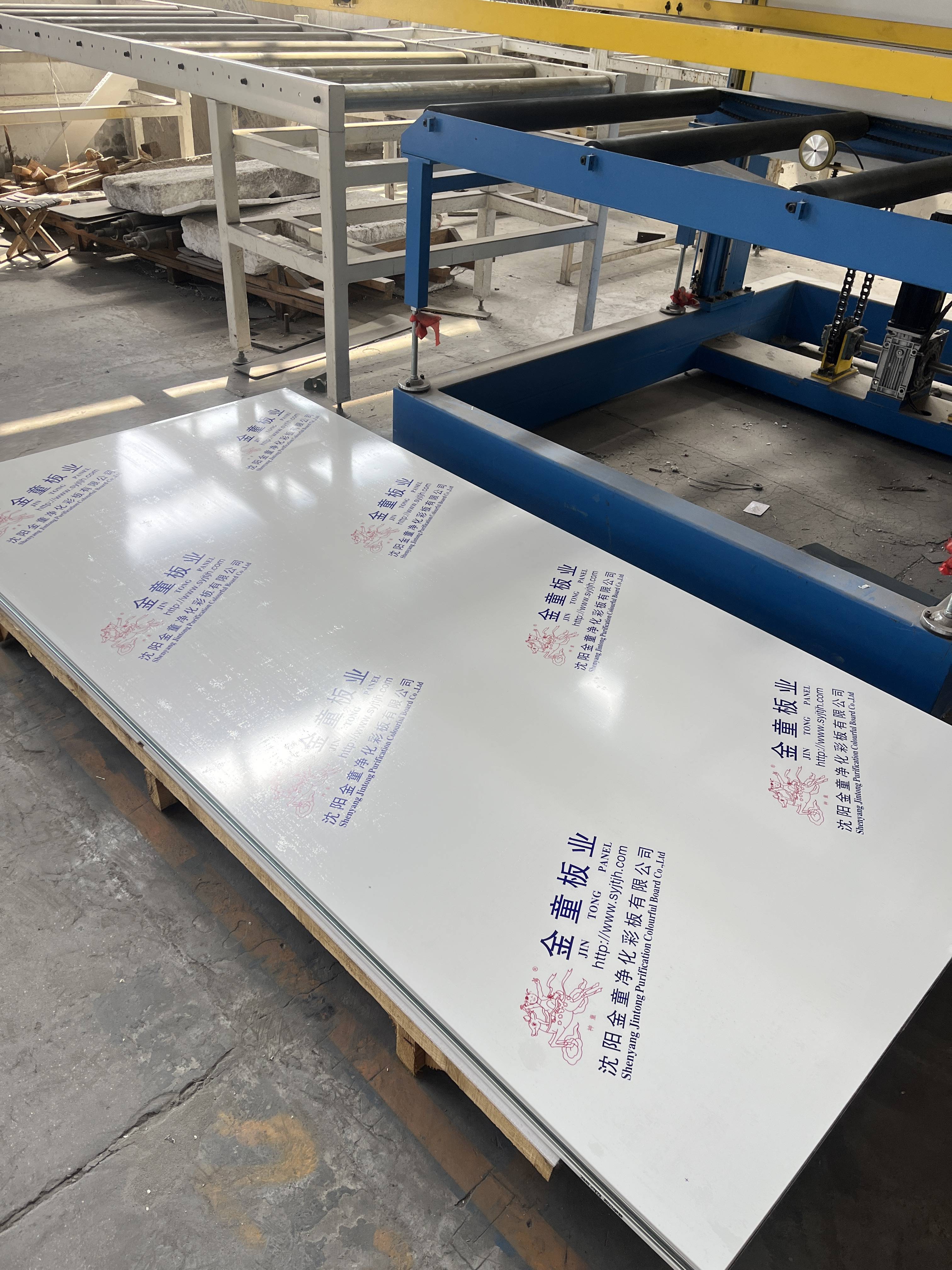 技术实力也是金童净化的一大亮点。公司依托科技促发展的理念,构建了高效智能的生产体系。拥有 2 条全智能一体化生产线,其中东北首台的JTFH - A 洁净室专用板材智能一体化生产线,集成开卷液压上料机、冷弯成型机等多单元设备,实现从原料到成品的全流程自动化。该生产线具备自动涨紧、精准淋胶、自动定长等优势,不仅生产效率较人工提升数倍,更保障了板材平整度与胶水粘合度,避免上下板面错位,成品码垛整齐精准。