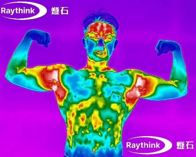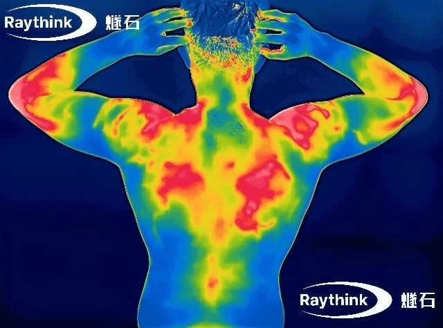 Raythink燧石热成像设备搭载自研高精度红外探测器与『芯片』,可分辨0.04℃细微温差,敏锐捕捉体表的微小温度变化。热力图中,红、黄色区域代表温度较高部位,蓝、紫色区域则对应较低温度,为早期健康风险识别和预警提供直观、科学的数据支撑。