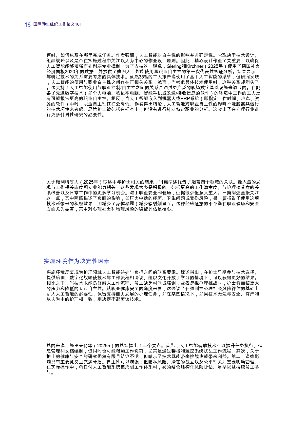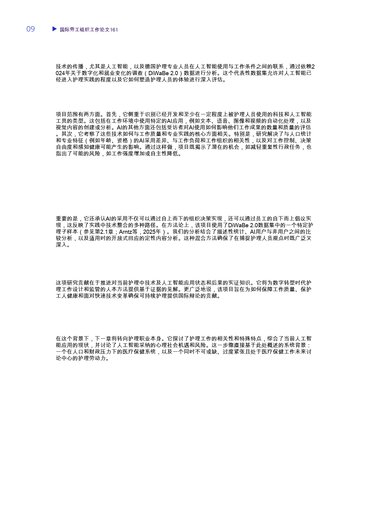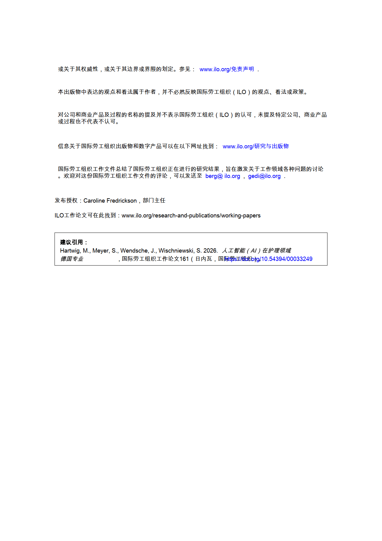 国际劳工组织 2026 年发布的这份工作论文,基于 2024 年德国『数字化』和就业变化调查(DiWaBe 2.0)中 9800 名受访者、165 名护理专业人员子样本数据,分析了 AI 在德国护理行业的应用现状、影响及相关问题,填补了该领域实证研究的空白。
