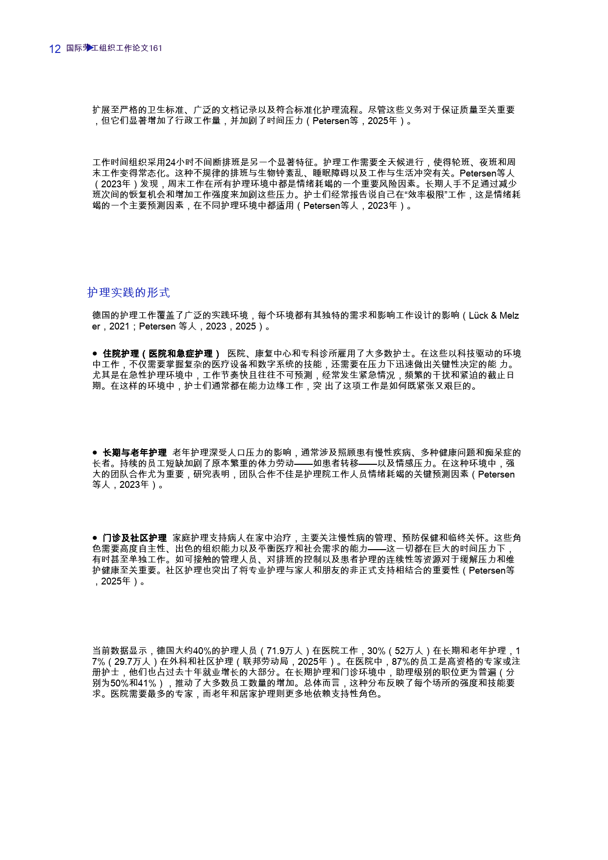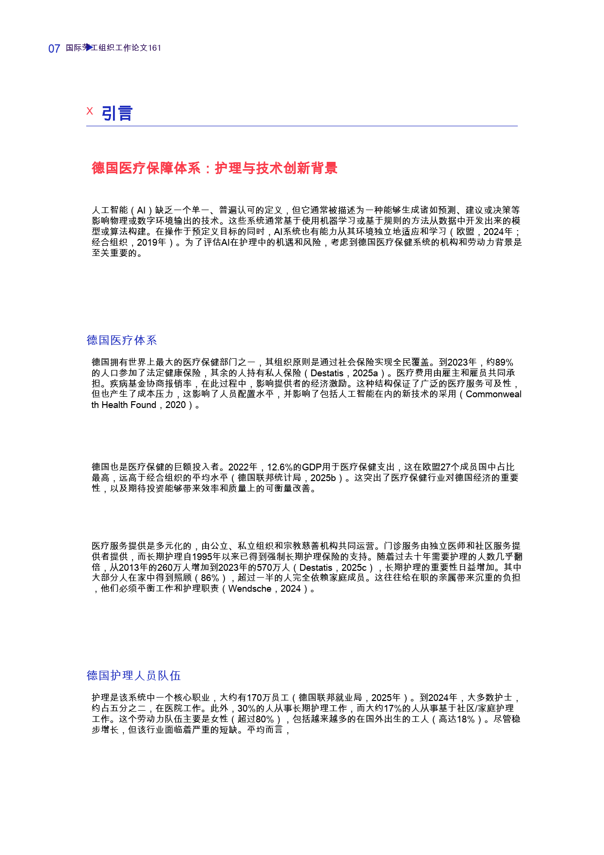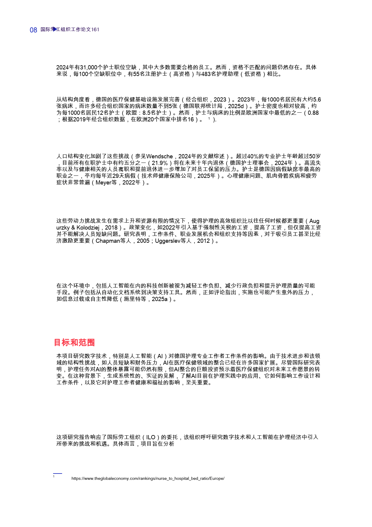 德国医疗体系全民医保覆盖,医疗投入占 GDP 比例居欧盟首位,但护理行业面临严峻挑战:2024 年有 3.1 万个护士职位空缺,超 40% 专业护士年逾 50 岁,未来十年五分之一将退休,护士年均病假近 29 天,身心疾病和职业倦怠问题突出。在此背景下,AI 被视为缓解护理负担的潜在手段,但其实际应用效果尚未得到充分验证。