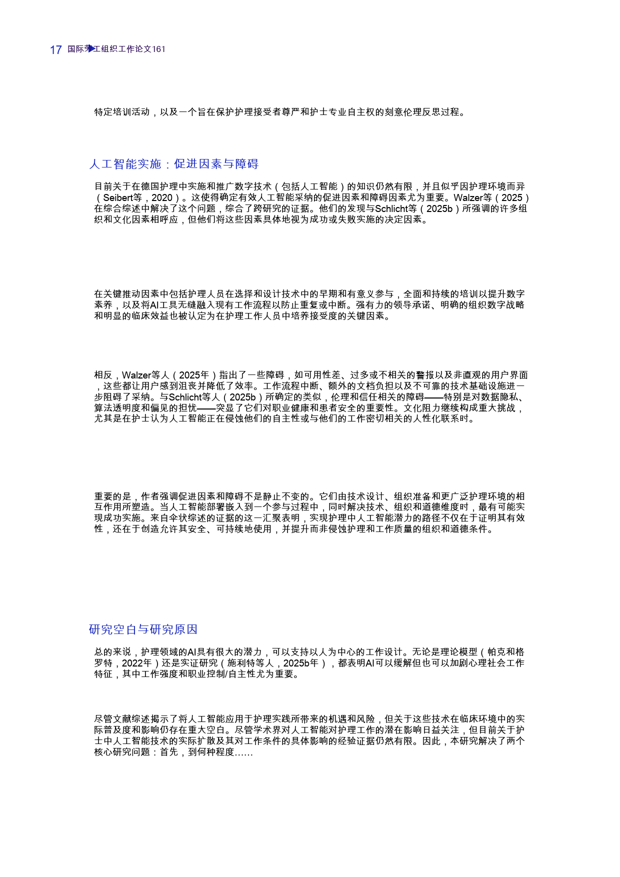 基于研究结果,报告提出未来研究需开展全欧比较研究、聚焦特定 AI 工具的中观研究、采用纵向设计,并探讨伦理、监管和教育问题。同时给出设计建议,强调 AI 实施需坚持以人为中心,保留护理人员的最终决策权,将 AI 与现有工作流程深度整合,优化文档处理等高频应用场景,同时关注技术可靠性和工作设计的整体性,避免因单一任务优化增加整体工作负担。