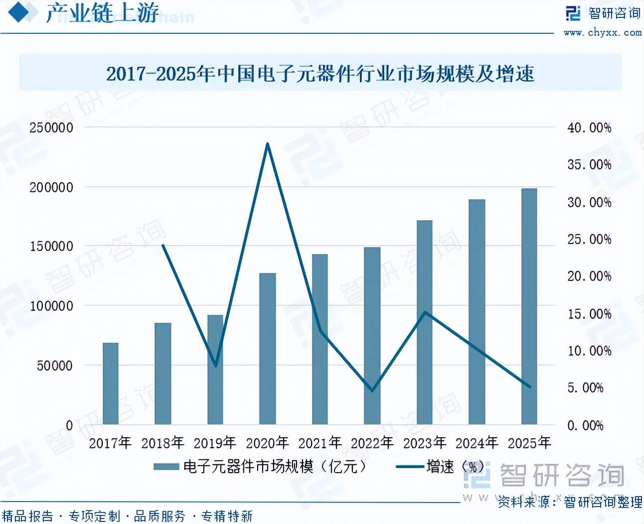 电子元器件是水质检测仪器的核心零部件,主要用于信号采集、数据处理、系统控制和信息传输等关键环节。电子元器件是构成电子电路的基本单元,能够实现特定功能(如电阻、电容、电感、二极管、晶体管等)的独立部件。近年来,随着5G通信、『新能源』汽车、物联网、人工智能等新兴领域的高速发展,对电子元器件的需求持续增加,推动了电子元器件市场规模快速增长。数据显示,中国电子元器件行业市场规模从2017年的68909亿元增长至2025年的198599亿元,年复合增长率为14.15%。未来,随着电子元器件进一步向微型化、低功耗、高精度与智能化方向演进,将为水质检测仪器带来更强的感知能力、更高效的数据处理效率以及更稳定的远程互联性能。
