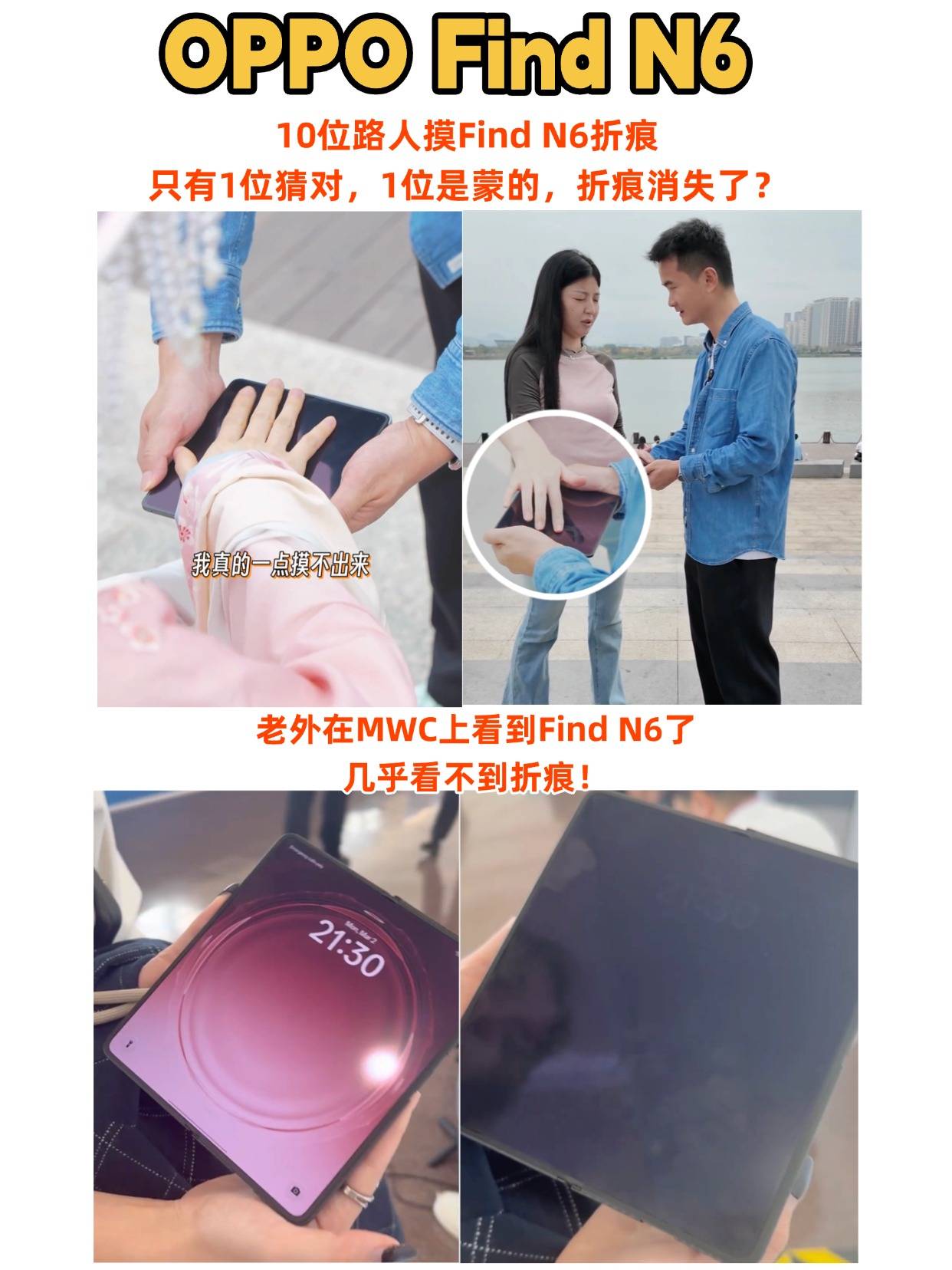 不过苹果折叠屏这么强了,不得卖两万块?起码一万五起步吧,而且这么强的铰链技术其实是借鉴OPPO的,现在Find N6开始爆料,有无痕钛合金铰链和自修复记忆玻璃,自己修复折痕?今年MWC上有人看到真机,官方还让路人摸了屏幕,似乎真看不到折痕啊!