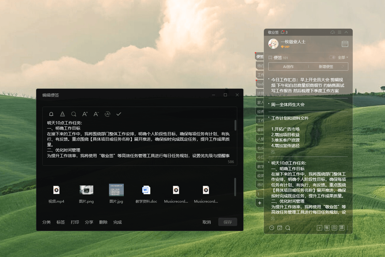 敬业签的便签记事功能十分强大,内存空间充足,支持不限字数记录,无论是工作方案、会议纪要、项目思路,还是日常灵感,都能完整保存,不用担心内容过长无法记录。除了文字记录,它还支持上传图片、音频、视频、PDF、Word等多种格式附件,文件存储能力堪比小型网盘,日常工作资料、学习资料、重要截图都能统一存放,不用再频繁切换网盘。