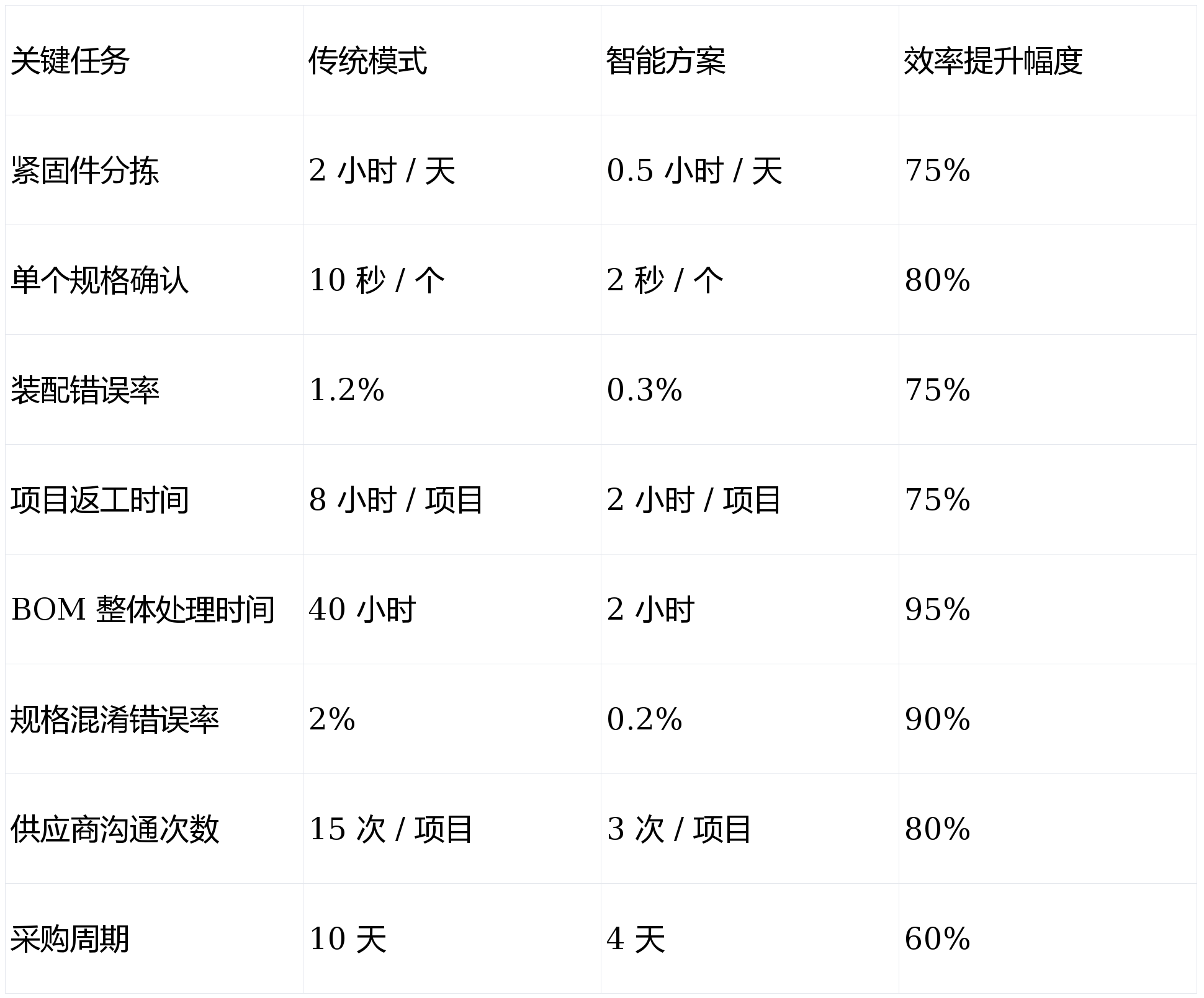 从设计端的 BOM 处理效率,到采购端的沟通成本,再到生产端的错误率控制,每一项数据都印证着方案对全流程的优化价值 —— 人工统计与校验工作量大幅减少,从源头规避紧固件选型错误、BOM 偏差等问题,让设计更高效,生产更顺畅。