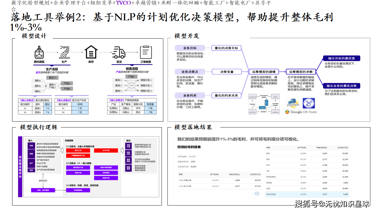 - 全局优化排程:基于需求预测、产能约束、原料供应、物流成本等多重约束,利用运筹优化算法,自动生成最优的生产计划和采购计划。