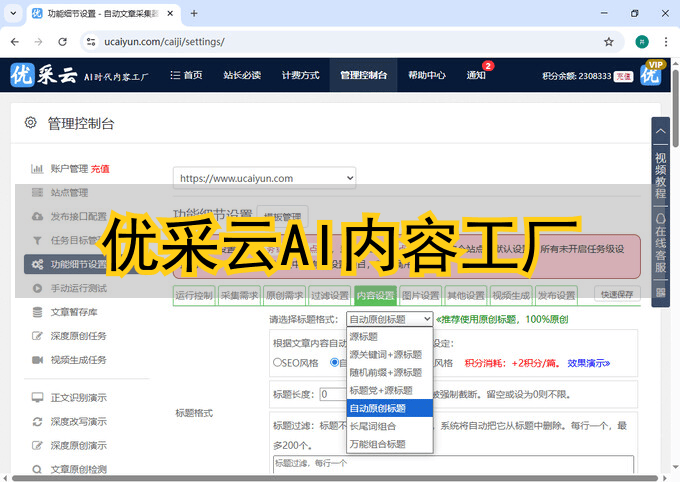 在“标题格式”中,选择“AI原创标题”,并设定为“SEO风格”,让标题既吸引人又包含关键词。