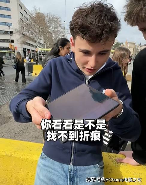 视频中提供了多个不同视角的镜头,在视觉上均能做到无折痕效果。如果不专门提及机型的话,展开后的大屏看上去就是一块完整的直面屏。这种实际上手的无折痕体验效果,让老外惊呆了。