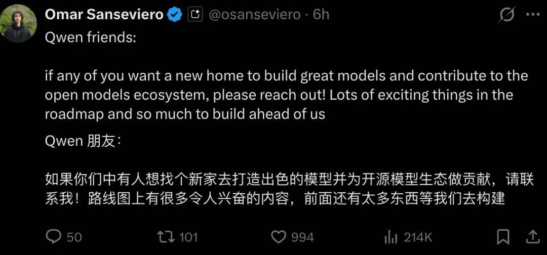 昨天下午,一点通 DeepMind 开发团队相关负责人 Omar Sanseviero 在 X 上向 Qwen 团队相关人员抛出橄榄枝: