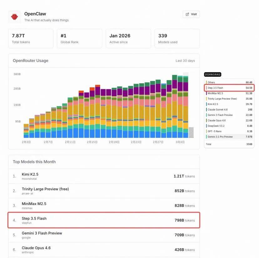 阶跃星辰 Step 3.5 Flash 调用量登顶小龙虾全球第一