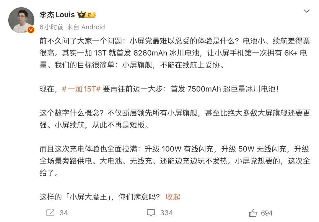 李杰:一加 15T 首发 7500mAh「超巨量」电池