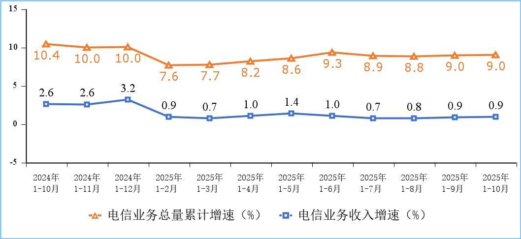 2025 年前 10 个月,电信业务收入累计完成 14670 亿元,同比增长 0.9%。按照上年不变价计算的电信业务总量同比增长 9%。