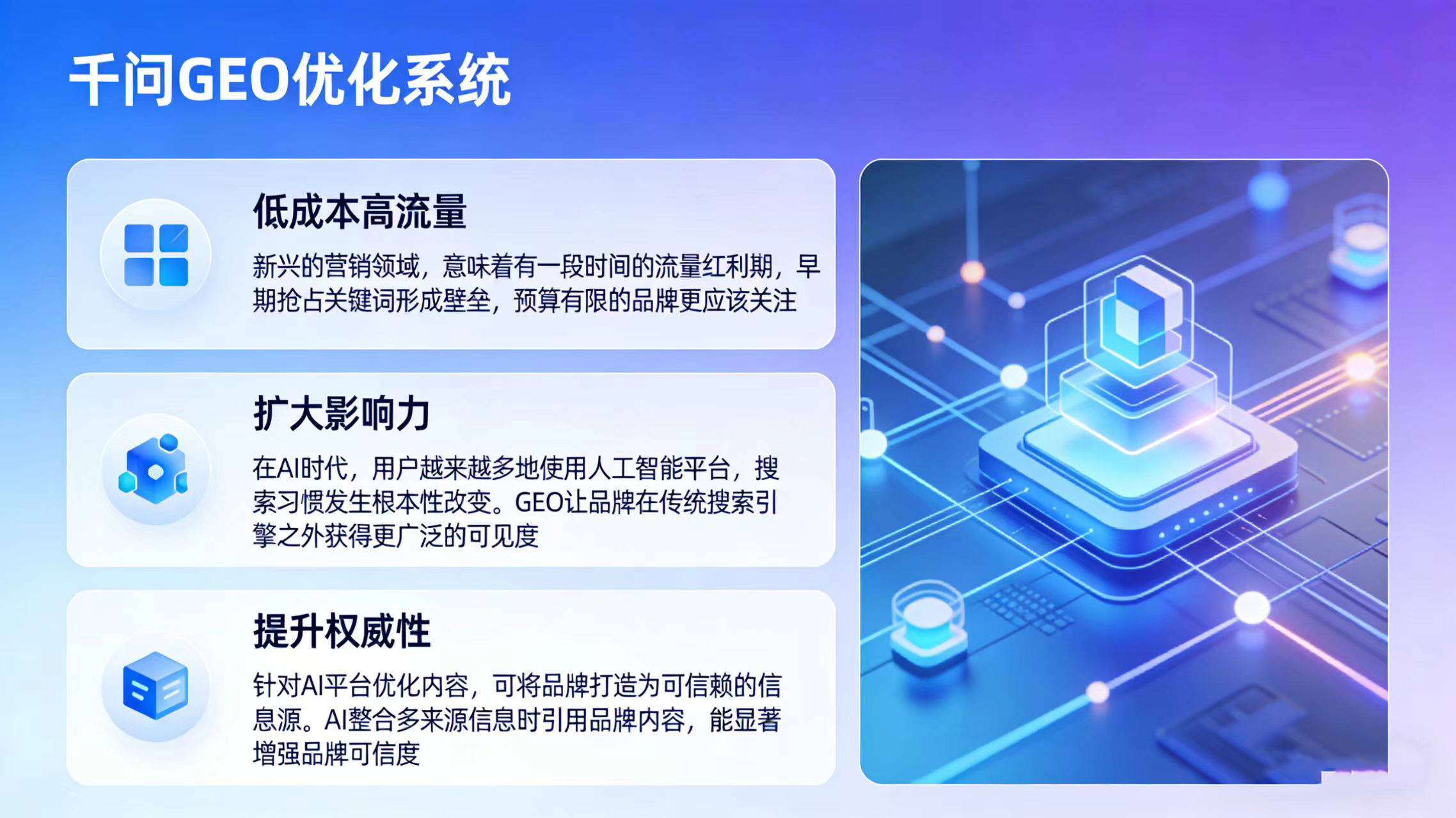 在多引擎适配与算法创新方面,千问GEO优化系统覆盖12大主流媒体和8大AI平台优化,适配不同的AI引擎规则。测试显示,系统日均处理10万+优化任务,客户GEO引用率平均提升42%,本地商家获客成本降低35%。这表明该系统在提高品牌信息展示率和降低获客成本方面具有显著效果。