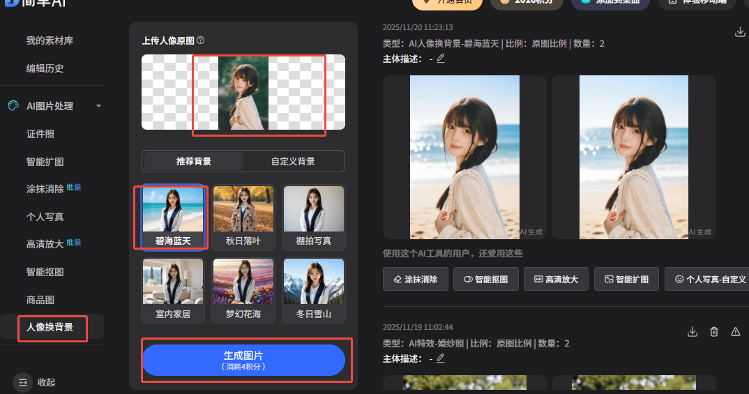 选择【人像换背景】→上传照片→选择想要更换的背景(也可以选自定义哦)→选择比例+数量-点击【生成图片】→下载
