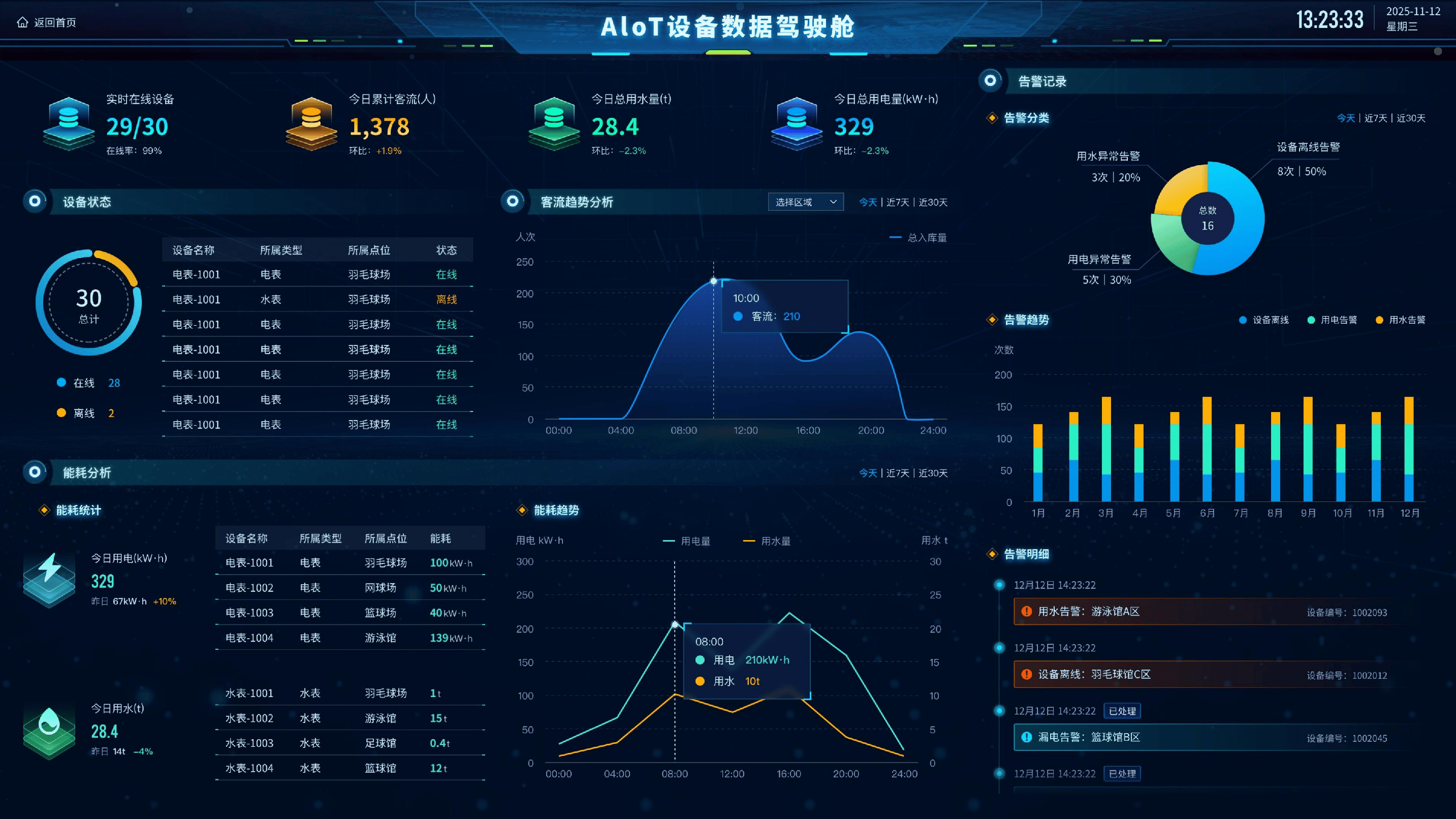 数据驾驶舱实现客流、能耗、安全、运维等核心数据实时可视化,让管理者全面掌握场馆运行态势,从经验决策转向数据决策。系统具备实时预警功能,全力保障场馆安全;通过深度数据分析,可优化开放时段、精准开展运营,真正实现降本增效与绿色低碳运营。