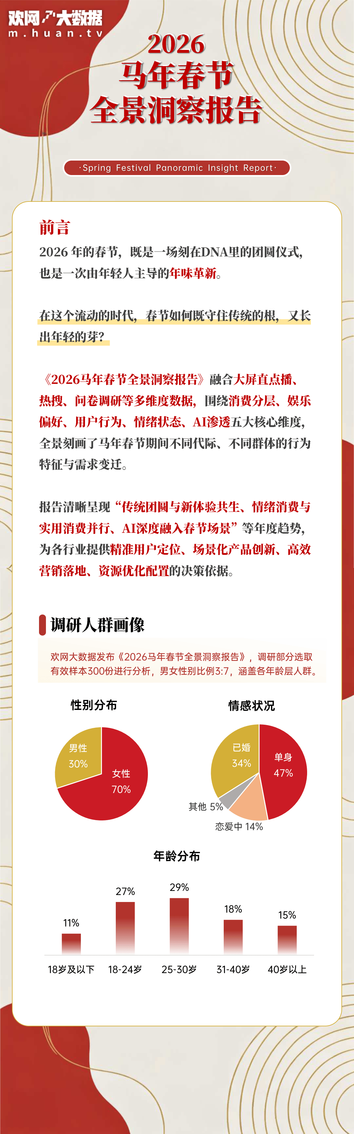 欢网大数据发布《2026 马年春节全景洞察报告》,基于 300 份有效样本分析(男女比例 3:7,覆盖全年龄层),呈现了马年春节民众的假期、情感、消费、习俗及娱乐等多维度特征。样本中单身人群占 47% 为主体,已婚占 34%,年龄分布以 25-30 岁(29%)、18-24 岁(27%)为主。