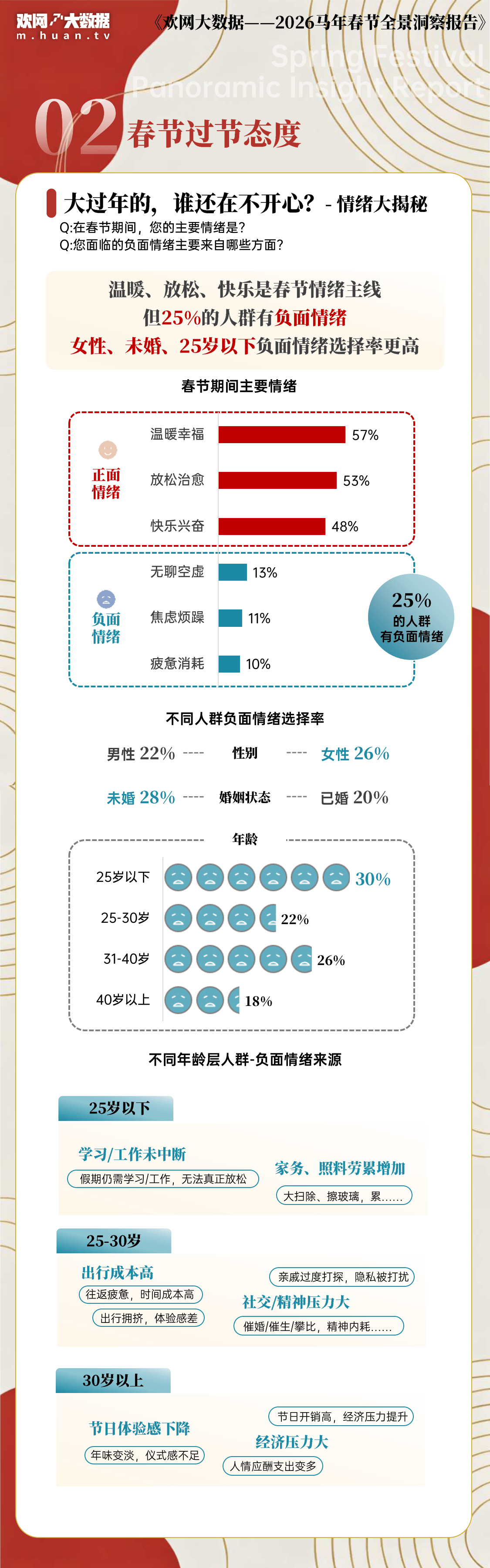 春节情感体验上,54% 的人因长假放松喜爱春节,44% 看重家人陪伴;57% 的人春节主要情绪为温暖幸福,53% 感到放松治愈,但 25% 的人群存在负面情绪,其中女性♀️、未婚者、25 岁以下青年负面情绪占比更高,负面情绪来源随年龄分层,年轻人受假期工作学习、家务困扰,中青年面临亲戚打探、催婚攀比,年长群体则因年味变淡、经济压力焦虑。