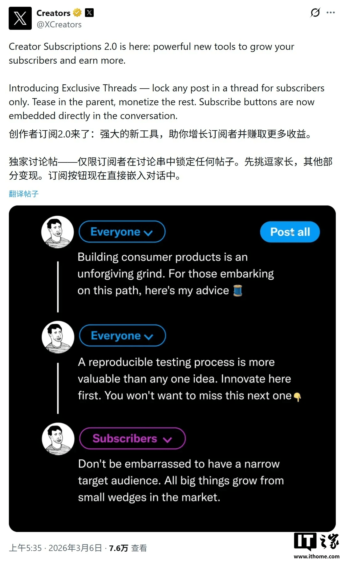 在本次服务升级中,最值得关注的是专属推文串(exclusive threads),创作者无需再将粉丝引流至外部网站或新闻简报,可以直接在 X 平台上实现内容变现。一点通附上相关截图如下:
