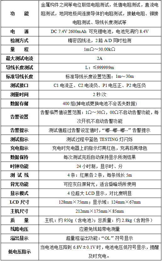 仪器具备告警、时钟及导线长度测算功能,由主机、软件、测试线、充电器、USB 通讯线组成。配备大屏背光 LCD 显示,可存储 400 组数据,配套软件支持数据读取、保存、报表与打印。
