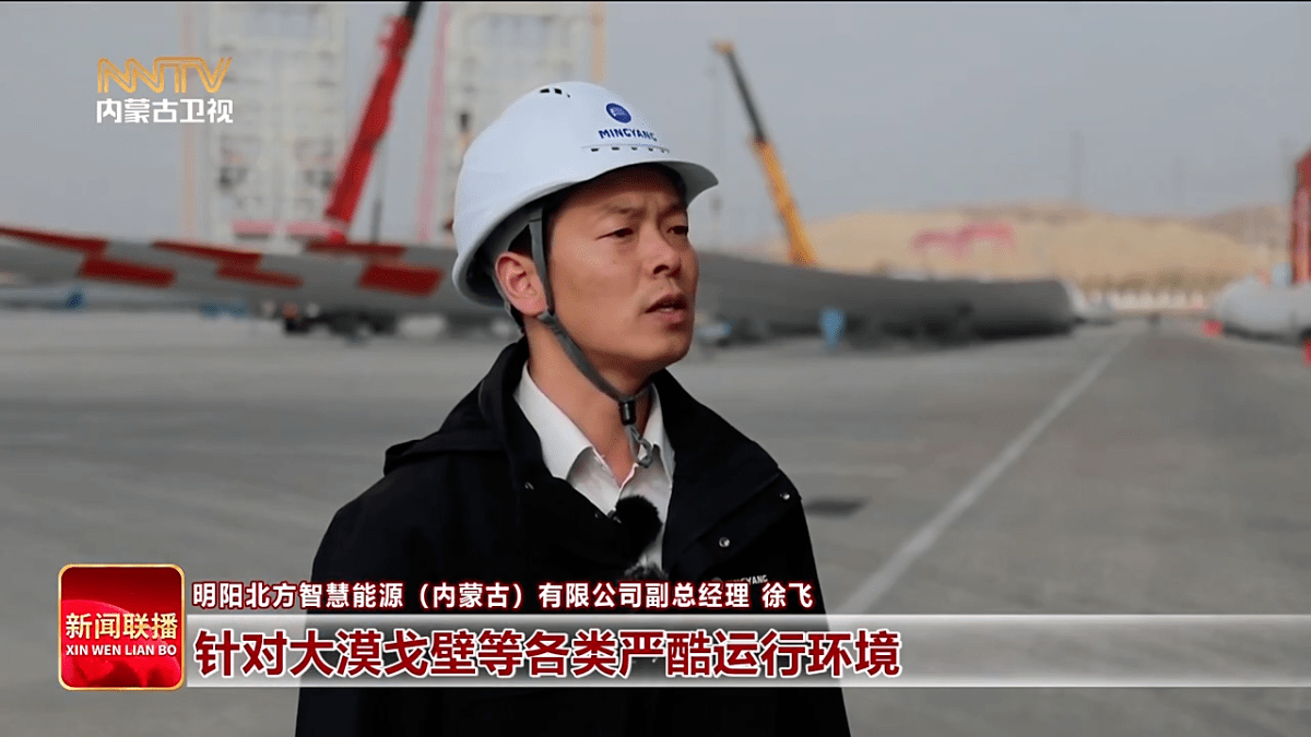 明阳北方智慧能源(内蒙古)有限公司副总经理 徐飞 明阳大兆瓦风机针对大漠戈壁等各类严酷运行环境,机型采用了全链条防护设计,能够有效地阻挡沙尘等杂物的侵入,机组可以适应在零下35摄氏度到50摄氏度的极端气候条件。