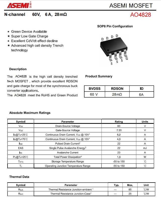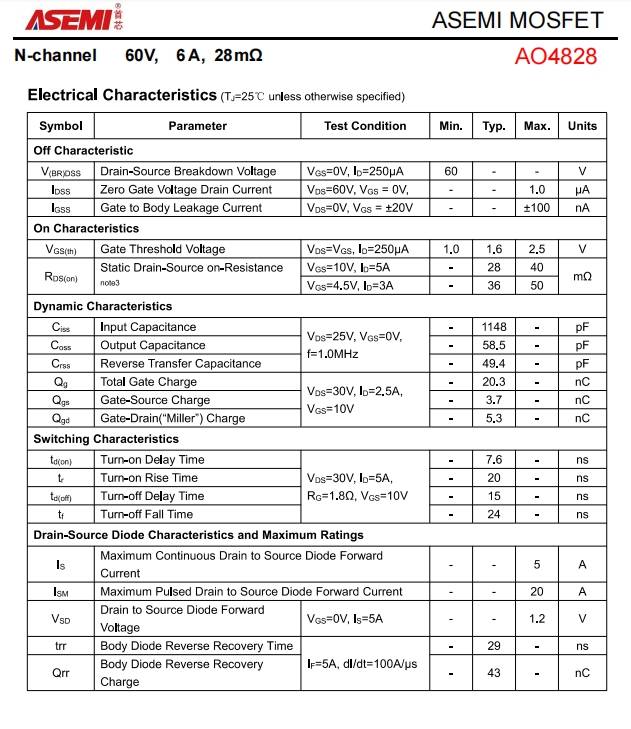 AO4828 的核心竞争力源于其精准匹配中低压场景的参数设计:60V 耐压值适配绝大多数消费电子、工业控制的电压需求,4.5A 连续漏极电流(Vgs=10V)足以驱动小型电机、电源模块等负载。更值得称道的是其超低导通损耗 —— 在 10V 驱动电压下,导通电阻 Rds (on) 低至 56mΩ,即便在 4.5V 低压驱动时也仅为 77mΩ,配合低至 4.3nc 的栅极电荷,不仅大幅降低开关损耗,更让 PWM 高频应用中的效率提升显著。实测数据显示,采用 AO4828 的 DC-DC 转换器效率可突破 90%,较普通 MOS 管降低 30% 以上的发热,让设备在长时间运行中依旧 “冷静” 可靠。