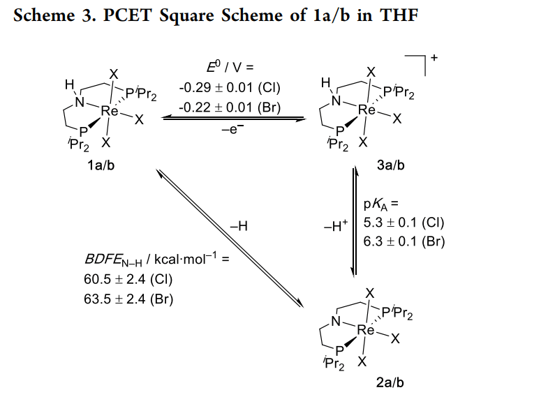 · 研究对象:研究者设计了一个特殊的铼(III)氨基二膦配合物 [ReCl2(PNP)]。该体系可以发生单电子氧化生成铼(IV),或发生 PCET 过程。