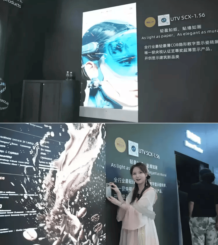 展位另一侧,人气的焦点集中在唯一获“央视认证”至尊奖的超薄显示产品——UTV SCX系列:屏体厚度仅12mm,较传统产品薄80%以上,重量仅12kg/㎡,并采用了“瓷砖式铺贴”设计,模组磁吸上墙,安装无需一颗螺丝,可贴装于任意材质墙面,即插即显,让高端显示像贴瓷砖一样简单。