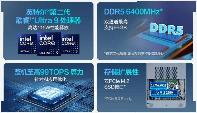 支持后期自主升级:双 M.2 接口可拓展 SSD,内存最高升级至 96GB DDR5,海量素材、文件、游戏轻松收纳,拓展性完全不输传统台式机。