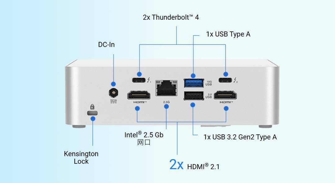 正面配备双 USB 3.2Gen2 Type-A+USB 3.2Gen2×2 Type-C,背面涵盖雷电 4、HDMI 2.1 等全规格接口,无需拓展坞,直接外接多台 4K 显示器,多屏办公效率飙升。