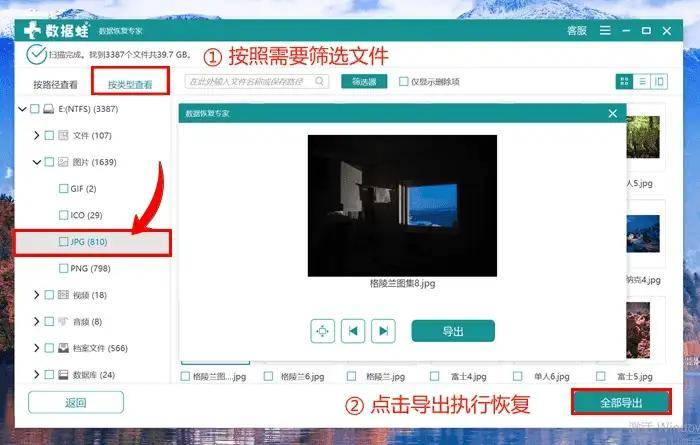步骤二:待软件将全部扫描结果呈现后,借助搜索框或者左侧的分类栏定位目标文件,找到后点击导出图标即可完成恢复。