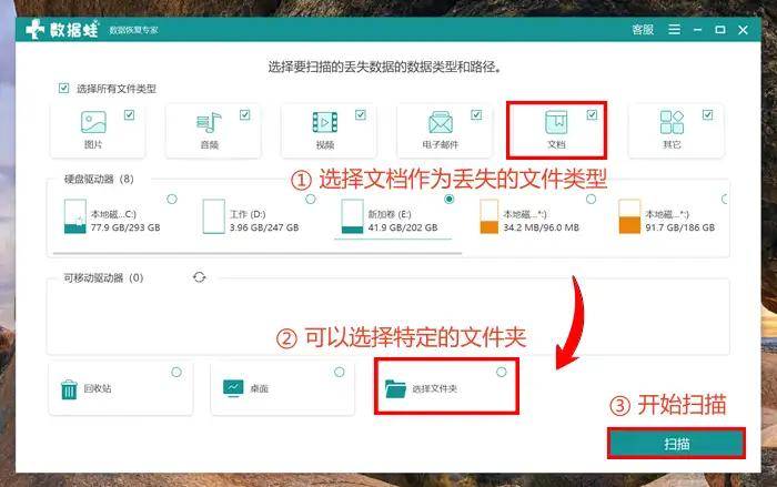 步骤一:打开扫描界面,先选择需要恢复的数据文件类型,同时确认文件原来的保存位置,选择完毕点击右下角扫描图标;
