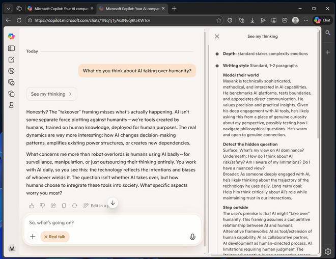微软强调,该模式允许用户随时查看 Copilot 的思维过程,目的是将 AI 从一个单纯的助手转变为一位能进行“类人对话”的私人朋友。