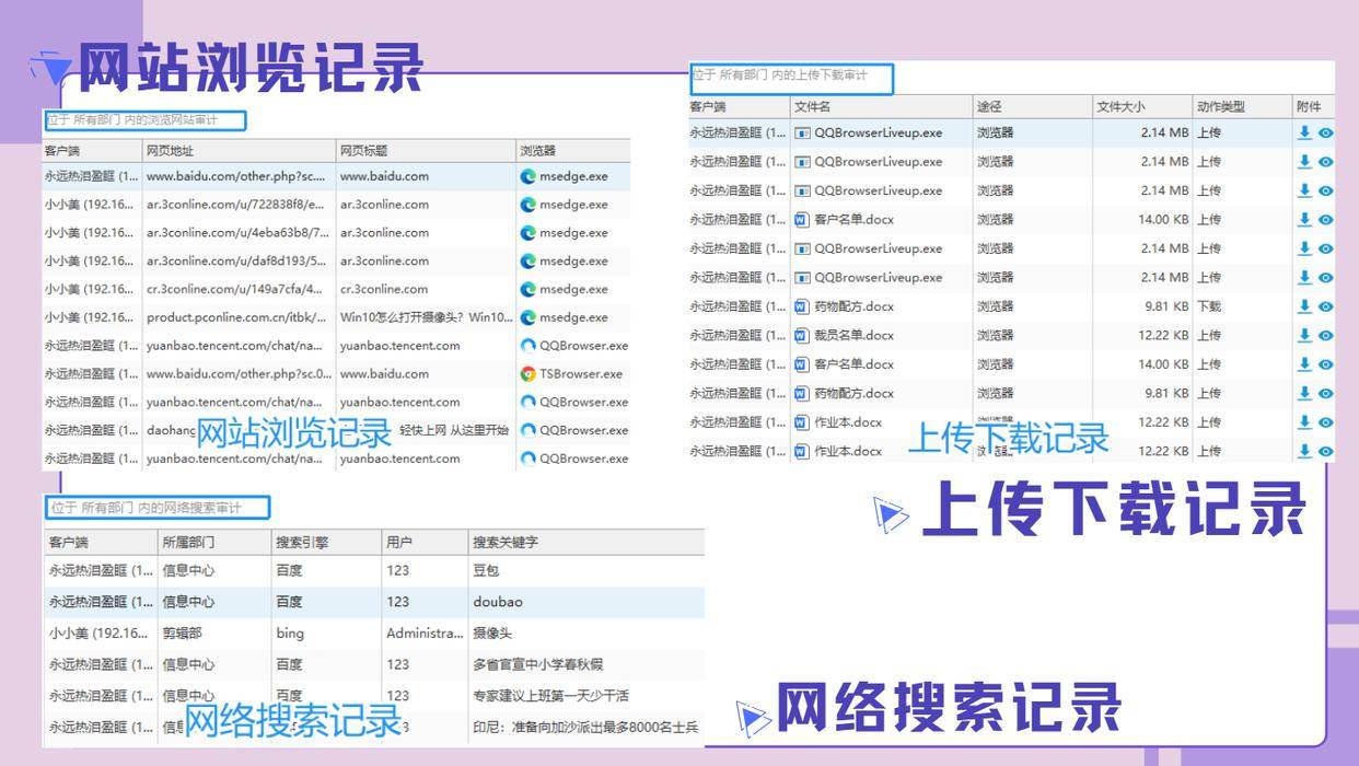 上了什么网站、搜了什么关键词(比如搜“怎么跳槽”、“怎么禁用监控”)、甚至上传下载了什么文件,它都记得一清二楚。特别是上传下载,连文件名都给你记下来,防止有人偷偷往外传资料。