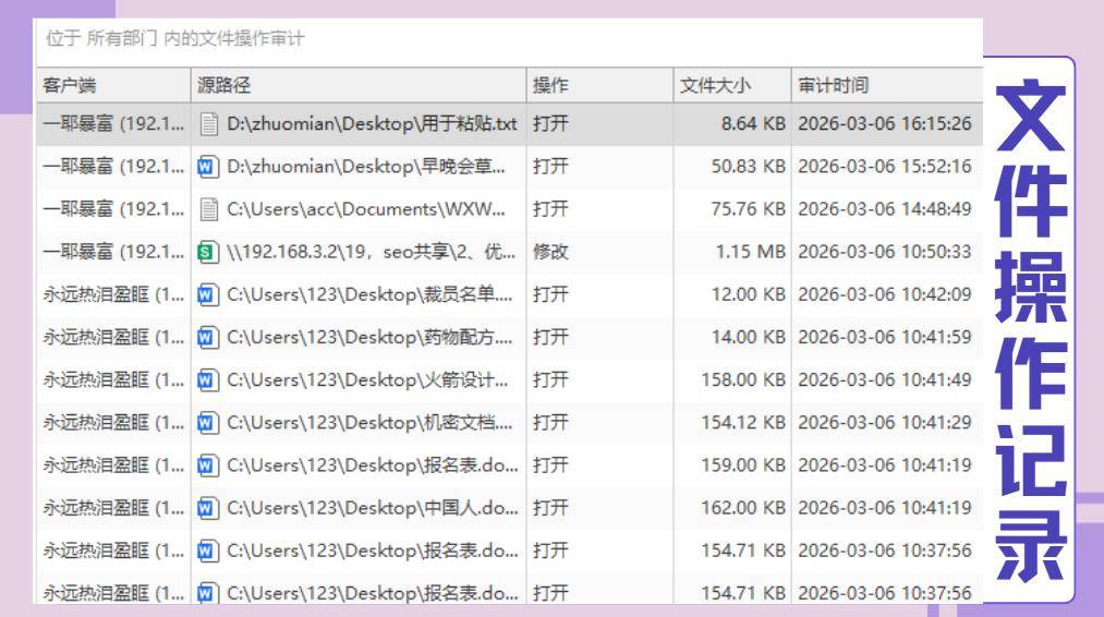 员工复制、剪切、删除、重命名文件,系统全都有记录。特别是想把文件拷到U盘或者发邮件外发,系统都会记录下来,有效防止公司机密泄露,再也不用怕员工偷偷带走核心资料。