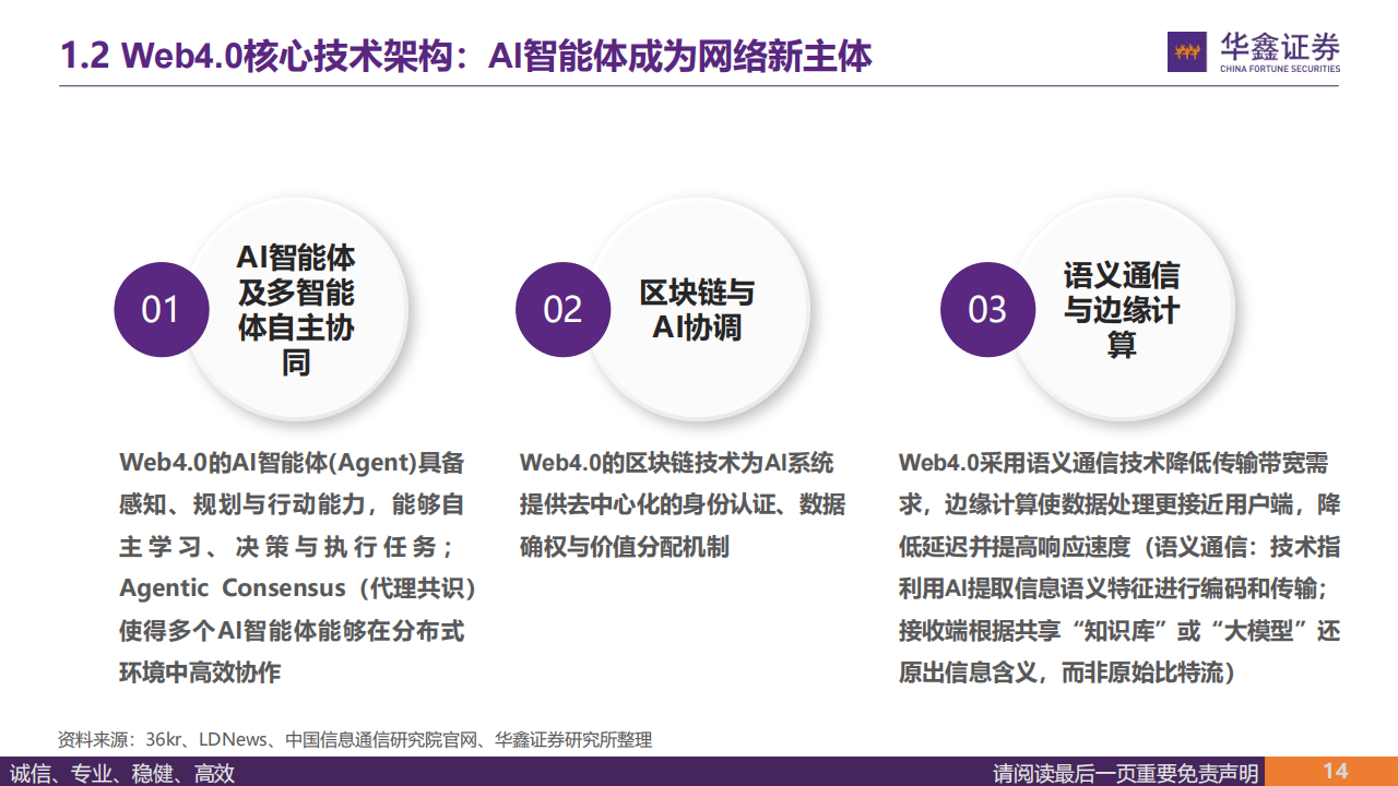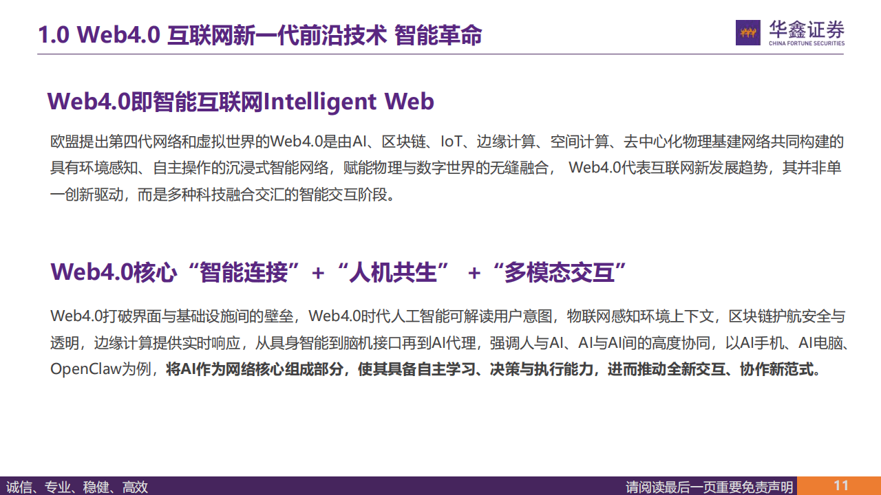行业发展上,传媒行业正从『数字化』向智能化跃迁,人机协作成为核心趋势,掌握AI协作能力与链上资产运营能力成为企业核心竞争力。同时,AI智能体在安全、算力等基建领域的应用持续深化,“云训练、边推理、端感知”成为AI时代标准架构,为Web4.0的落地提供技术支撑,存量企业与AI新势力均迎来发展新机遇。
