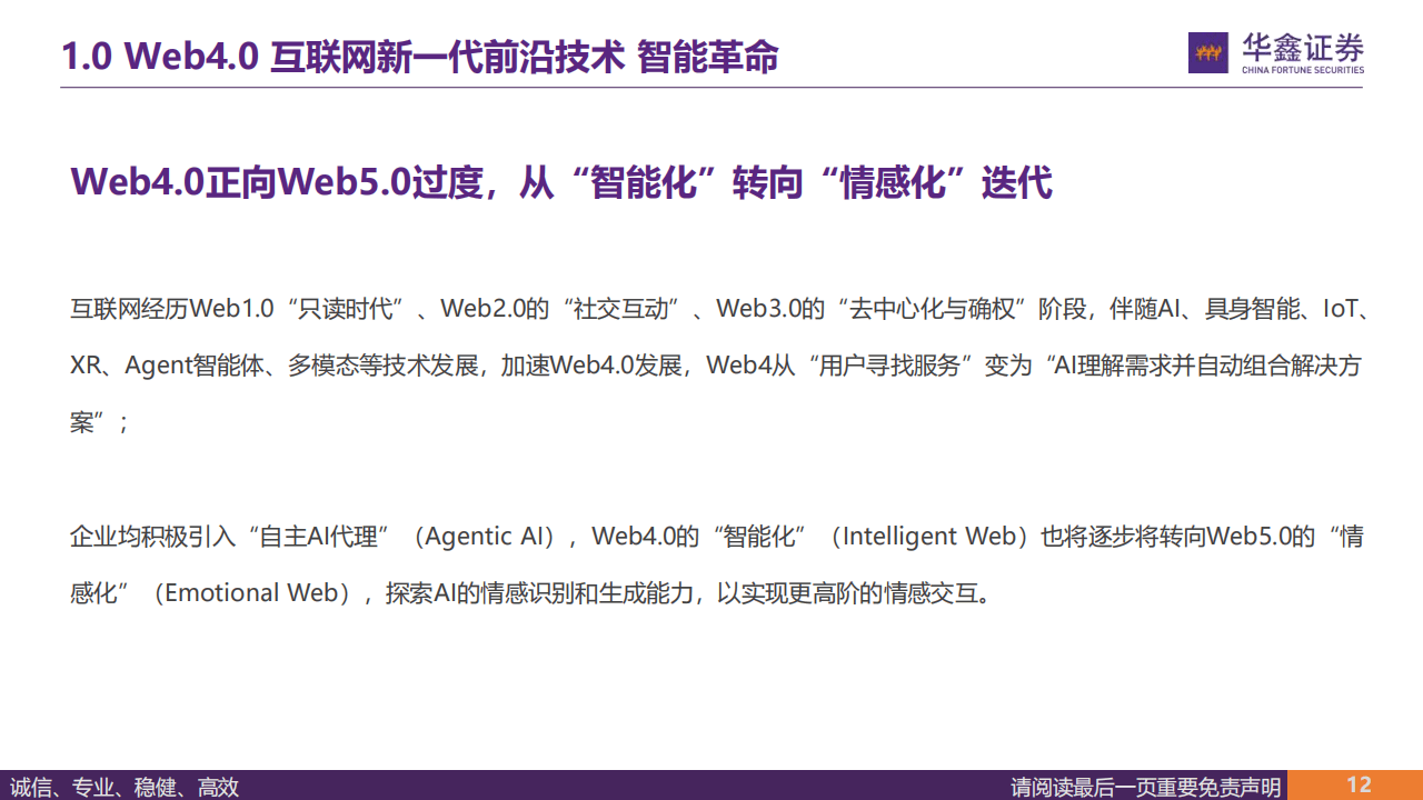 本报告聚焦Web4.0时代AI对传媒行业的赋能逻辑与发展趋势,指出Web4.0作为『互联网』发展新阶段,以智能为核心驱动力,通过AI、区块链、IoT等多技术融合,构建起“智能连接+人机共生+多模态交互”的沉浸式智能网络,推动人工智能从工具向具备自主决策能力的智能体演进,进而引发生产力与生产关系的范式革命,同时Web4.0也正逐步向侧重情感交互的Web5.0过渡。
