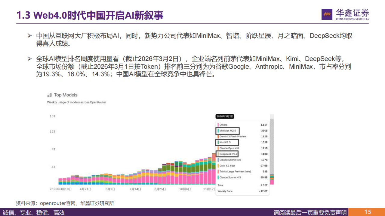 技术层面,Web4.0的核心架构以AI智能体为网络新主体,结合区块链的安全确权、语义通信与边缘计算的实时响应能力,实现多智能体自主协同;中国AI新势力表现亮眼,MiniMax、『DeepSeek』等企业在全球AI模型市场占据重要份额,其中MiniMax正从大模型公司向AI平台型企业转型,在多模态创作领域实现技术突破,字节跳动则构建起以『豆包』大模型为核心,覆盖C端应用与智能硬件的AI生态闭环。