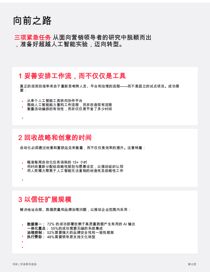 针对上述问题,报告提出了AI规模化扩展的三大核心举措:一是做好工作流编排,从单一AI工具转向协作平台,围绕AI能力重构流程,而非改造现有流程;二是回收战略和创意时间,将自动化释放的时间重新分配给战略规划,聚焦AI无法复制的创造性工作;三是建立信任以实现规模化,以高质量数据为基础,推动系统无缝集成,搭建品牌安全治理框架,并获得领导层对文化转型的支持。
