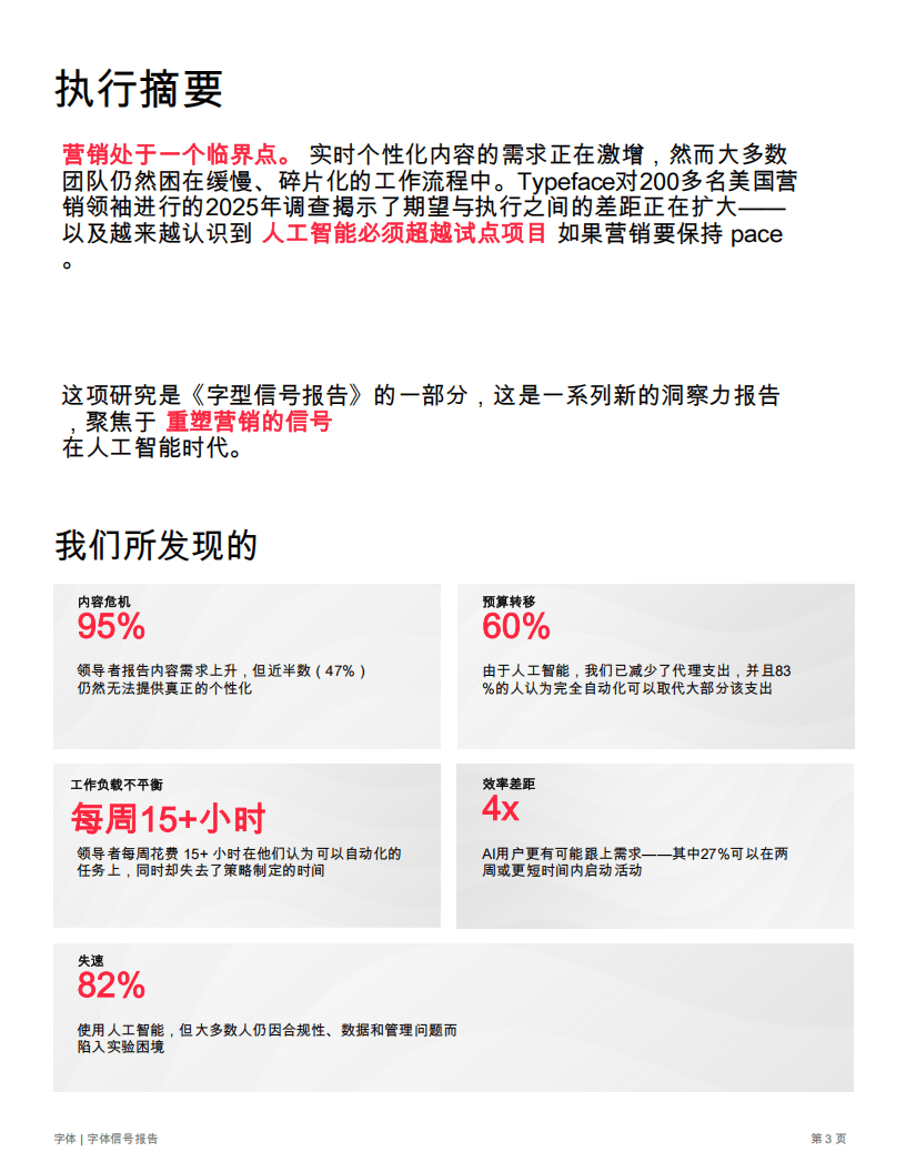 这份Typeface针对美国200多名营销领袖的2025年调研报告,核心围绕营销领域AI试点项目的发展困境与规模化扩展路径展开,揭示了AI时代营销行业在需求、执行与转型间的深层矛盾。报告指出,当下营销行业正处于临界点,实时个性化内容需求激增,但多数团队仍受困于碎片化工作流程,AI应用虽广泛却深陷试点困境,期望与执行的差距持续扩大。