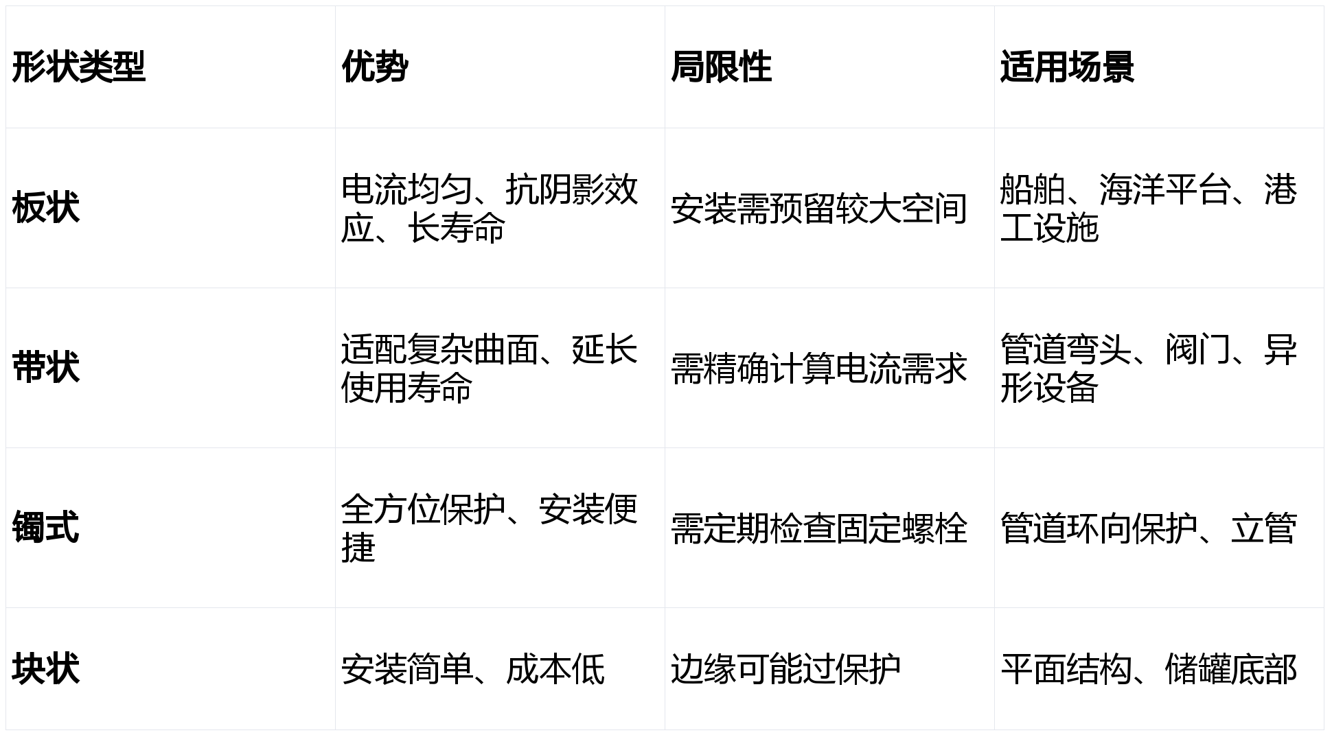 - 在复杂结构中,板状阳极的宽大表面可减少其他部件遮挡导致的保护盲区,确保电流覆盖整个区域。