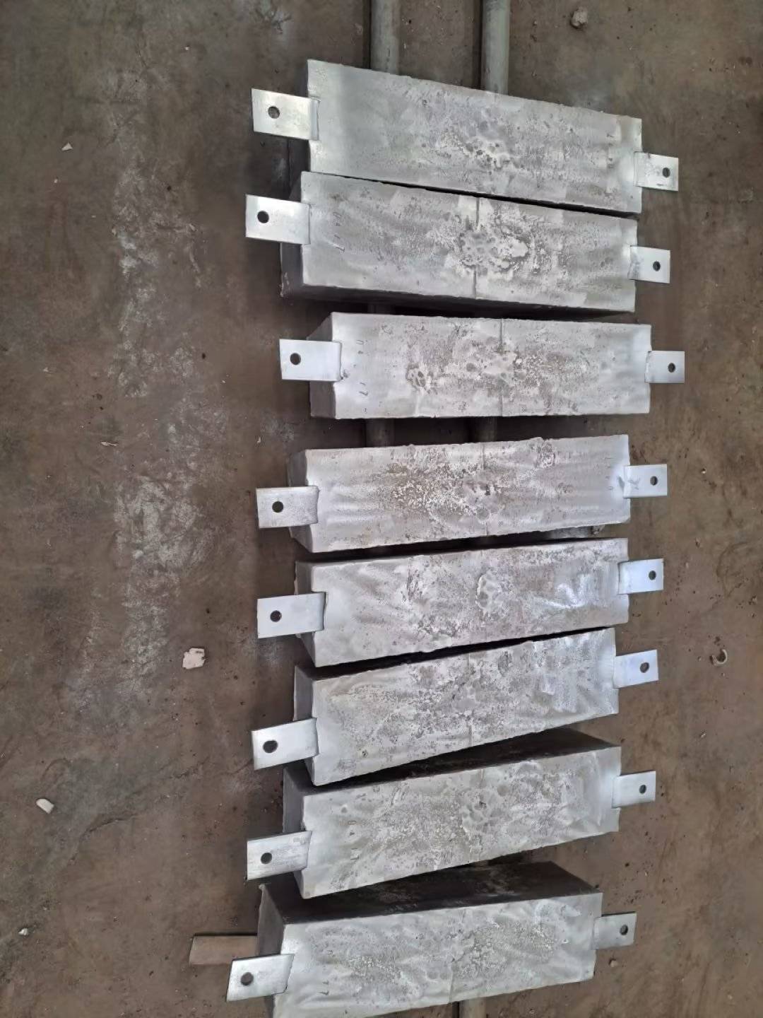 - 板状阳极通常为矩形平板结构,尺寸较大(如长×宽×高为200mm×100mm×50mm),厚度均匀,表面平整。部分型号会通过钻孔或开槽增加表面积,提升电流输出效率。
