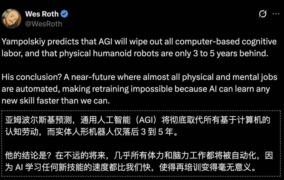 通用人工智能(AGI)将彻底取代所有基于计算机的认知劳动,而实体人形『机器人』️仅落后 3 到 5 年。